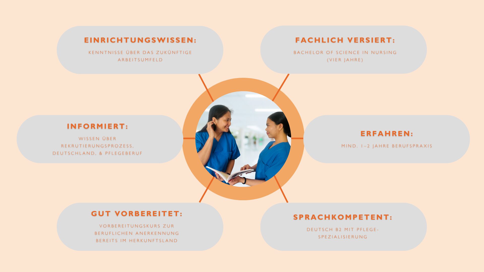 - Unsere Bewerber erhalten ein kulturelles Briefing und kennen die Unterschiede zur Pflege in Deutschland. Dein Unternehmen stellen wir attraktiv vor – inklusive 1:1 Interviews statt unpersönlicher Gruppenrunden.